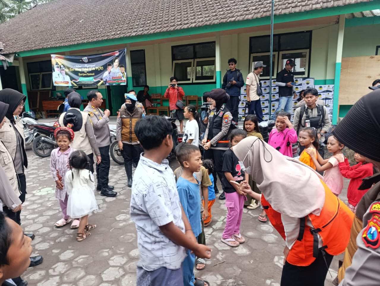 Di tengah udara dingin pegunungan, para Polwan Polres Lumajang Polda Jatim berdiri sambil tersenyum, berusaha memecah kebekuan emosional yang sudah berhari-hari menyelimuti anak-anak itu.
