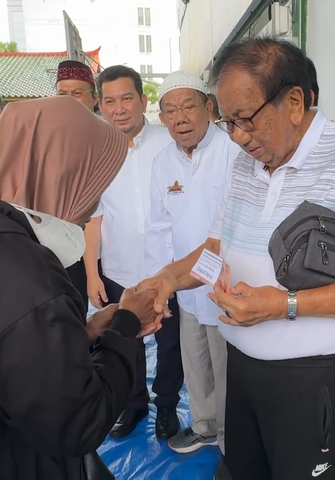 Pengurus Masjid Cheng Ho tengah menyalurkan bantuan tunai kepada warga.